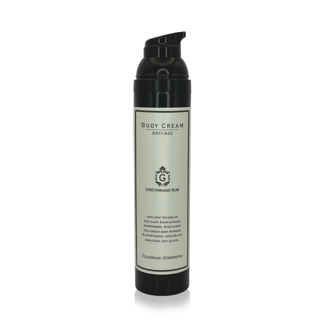 Anti-Age Body Cream med Algica och bakuchiol. Vi har skapat en utsökt exklusiv Anti-Age Body Cream. Den kommer i en airless flaska och är alltså helt lufttät. Produkten håller sig fräsch. Anti-Age Body Cream är en silkeslen och återfuktande kroppskräm. Den har en lätt textur som snabbt absorberas av huden och ger en djupt återfuktande effekt. Jobbar mycket effektivt på torr rynkig, slapp hud. Samt celluliter. Ger en fin lyster och spänst till torr hud.