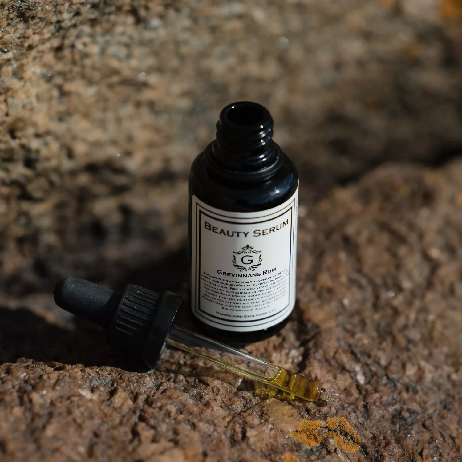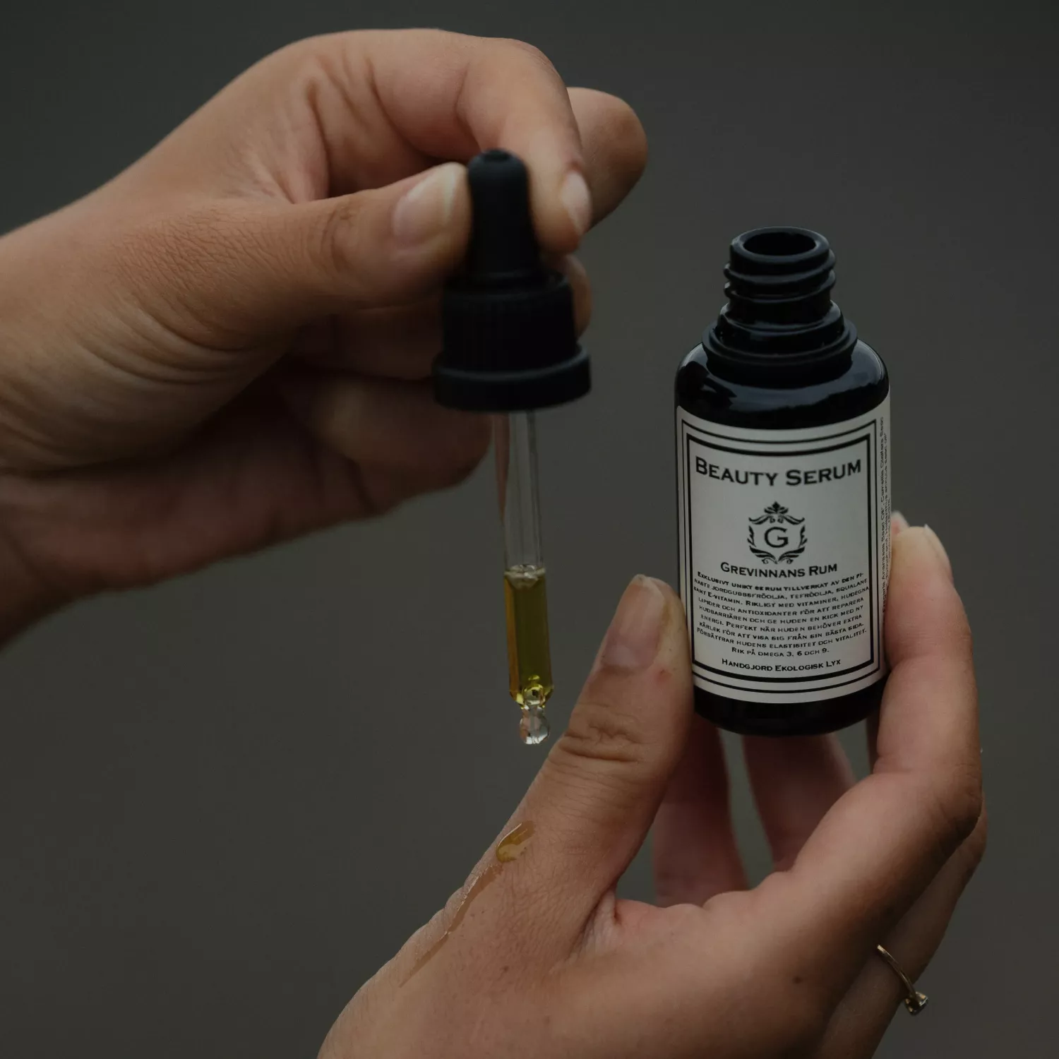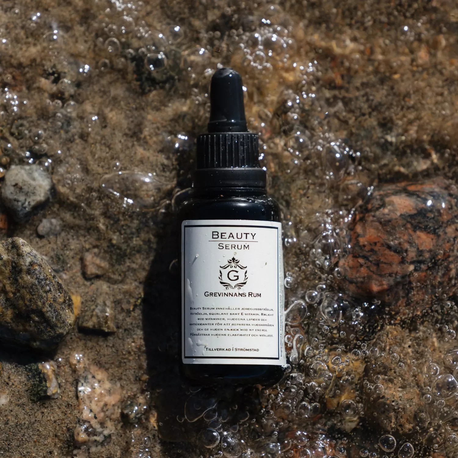 Torr olja som läggs närmast huden och följs upp med ansiktsolja Lyx eller Extra Lyx. För den som vill ha ännu mer korrigering och anti-age läggs Face Cure serumen före Beauty Serum. Sist avslutas om man önskar Face Cream Algica eller Face Moisturizer. Ni är många som önskat ett extra lyxigt och avancerat serum. Lätt och skönt på huden. Beauty Serum kan användas separat om man önskar. Det skall kännas härligt på huden. Doften är svag av jordgubb och blad. Mild och härlig doft. Används både morgon och kväll. Passar alla hudtyper även den känsligaste. Magisk på sommaren och gudomlig resten av året. Säljes i 30 ml svart uv-skyddande glasflaska med pipett