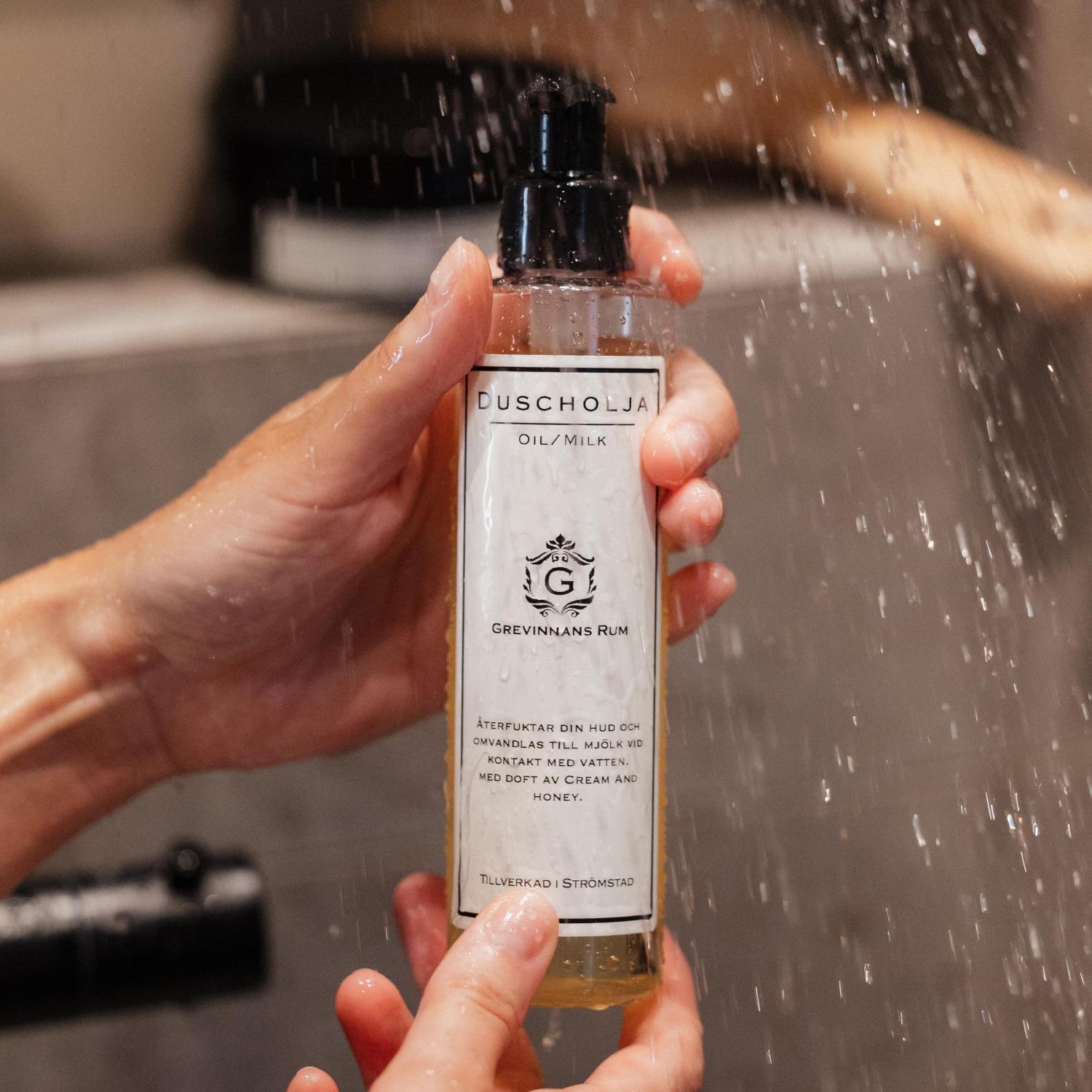 Lyxig dusch- och badolja som rengör och återfuktar på samma gång. Vid kontakt med vatten förvandlas oljan till en silkeslen mjölk som skonsamt rengör huden och lämnar den mjuk och väldoftande. Doften av milk and honey är klassisk och unisex. En himmelsk kombination som för tankarna till ren njutning. Berikad med ekologiska och veganska oljor som argan, solros, jojoba och ricin för optimal hudvård. En modern tolkning av Kleopatras skönhetsritual med en vårdande twist. Oljan omvandlas till en rengörande mjölk när den sköljs av.