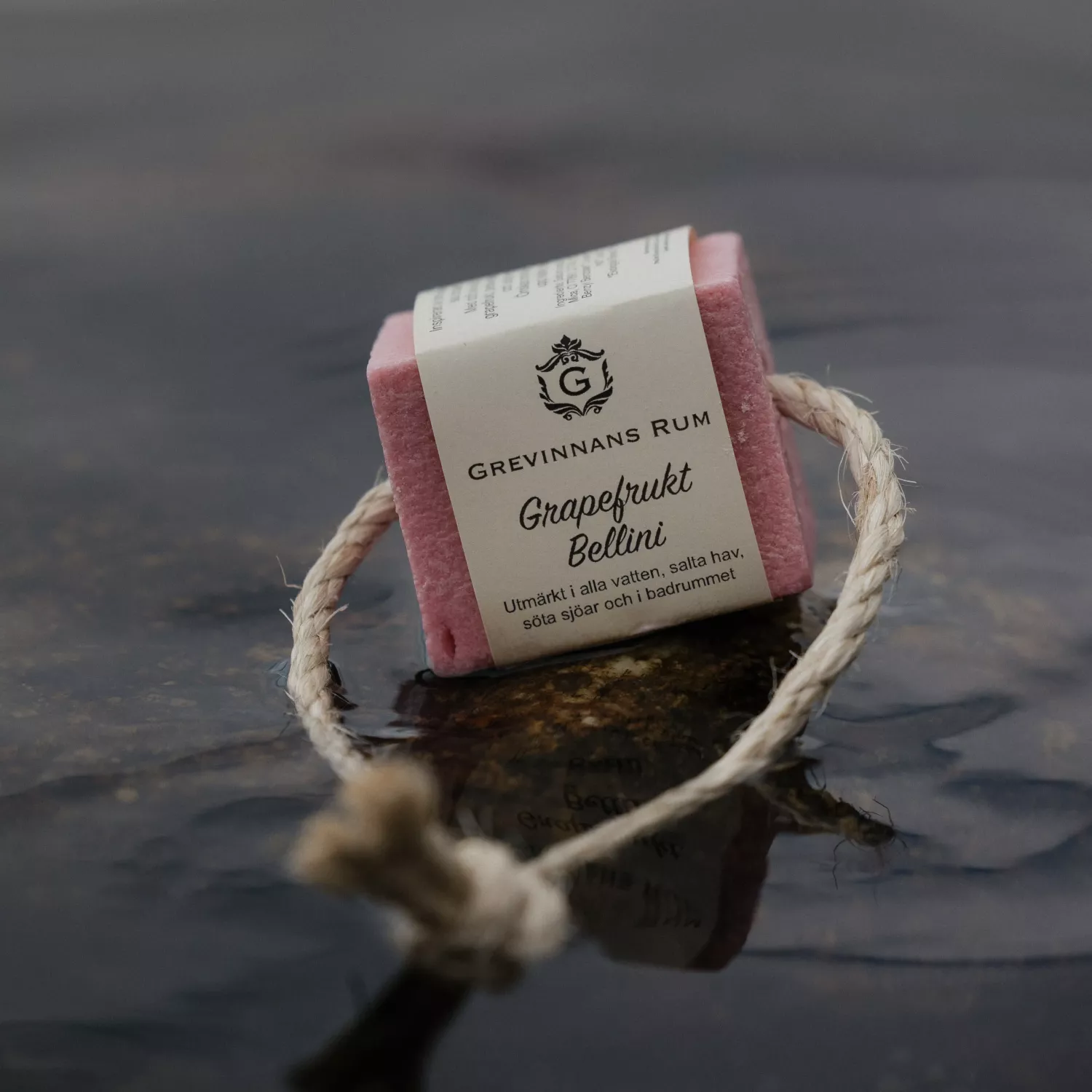 Grapefrukt Bellini är en handgjord, somrig lyxtvål med en förtrollande doft av rosa grapefrukt, persikonektar, rabarber och mjuk musk. Inspirerad av den italienska cocktailen från 1948 och berikad med Döda havssalt och ekologiska oljor ger den ett rikt lödder och silkeslen hud. Perfekt att ha med i duschen, sjön, havet, eller varför inte tvåla in sig i regnet. En robust tvålbit med tågvirke som doftar underbart och ser fantastisk ut.