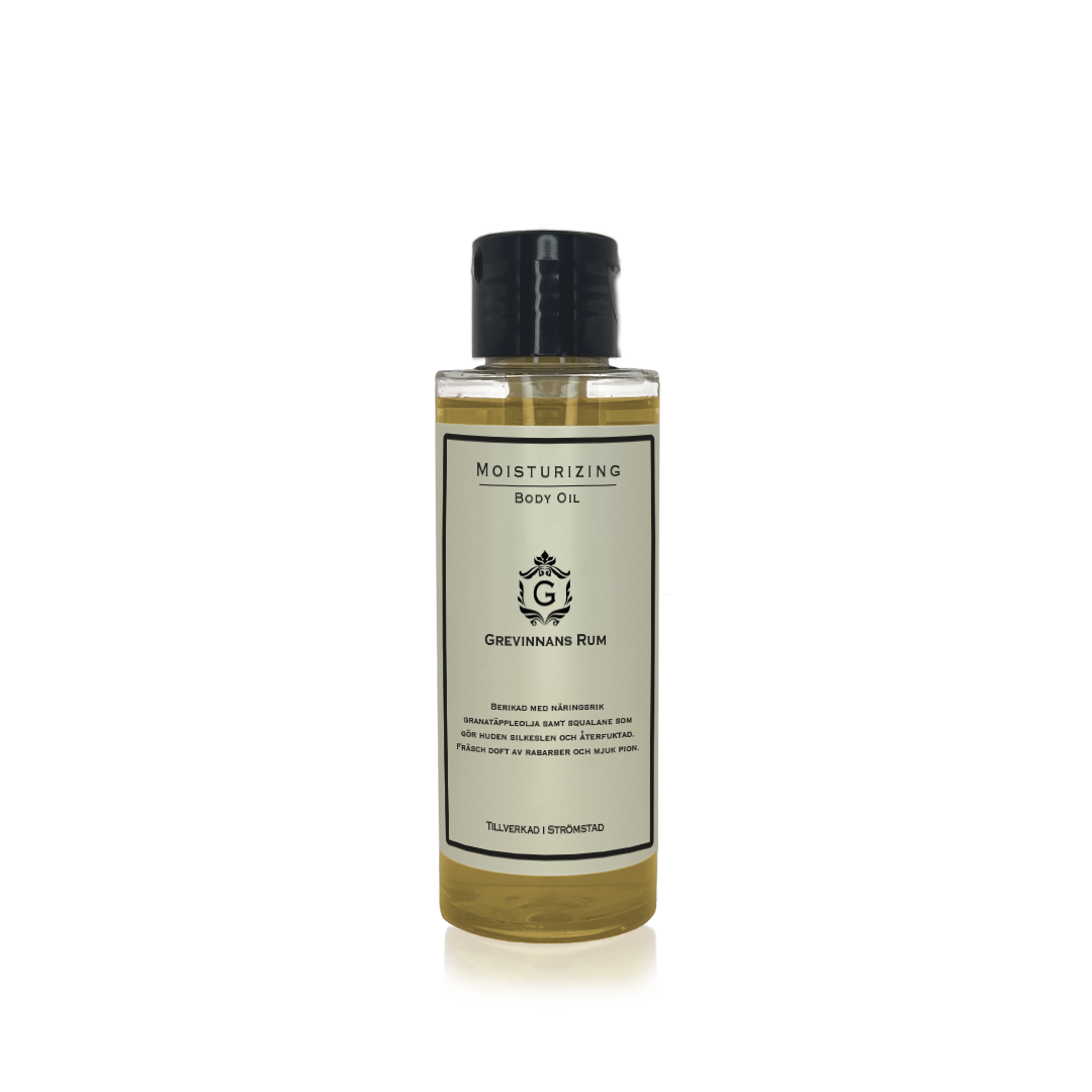 Volym: 100 ml. Innehåller ekologisk tistelolja, granatäppleolja, jojobaolja och solrosolja som tillsammans stärker, mjukgör och skyddar huden. Squalane bidrar till att bevara hudens fuktbalans och gör den smidig och elastisk. Kroppsoljan absorberas snabbt och ger en mjuk, återfuktad hud med naturlig glöd. Den balanserade doftkombinationen av rabarber och pion ger en fräsch, upplyftande känsla.